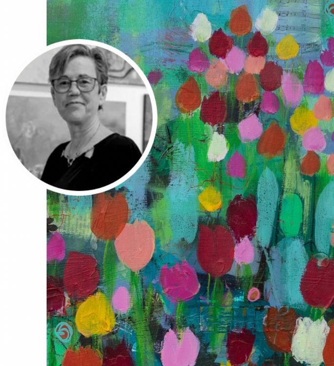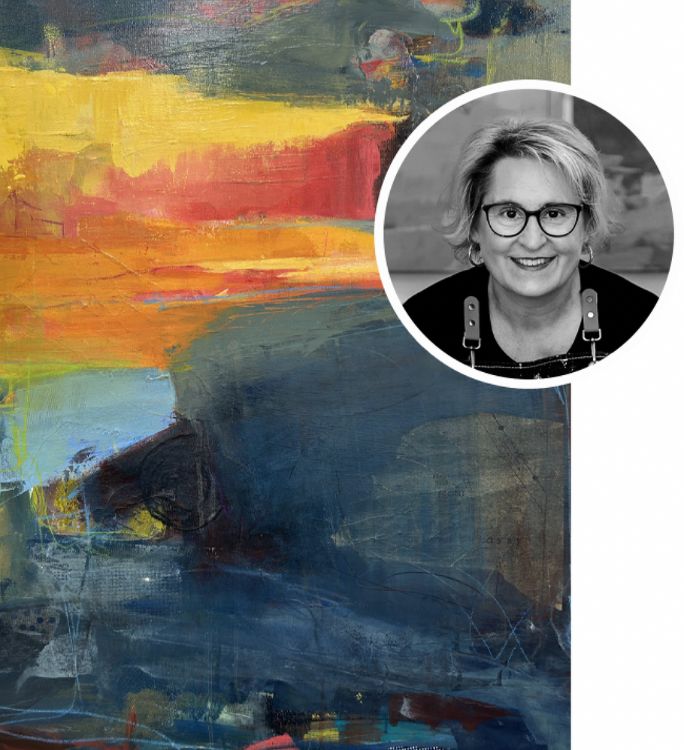 Nadine Johnson is a Calgary-based abstract painter whose work grows from layers of color, collage, and lived experience. She paints intuitively, letting memory, place, and personal history guide the process, a slow unfolding where each mark influences the next. Her paintings draw from the things she carries with her: florals, prairie horizons, old fences, family stories, and the quiet textures of remembered places.